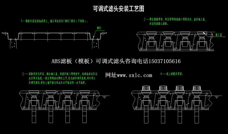 水廠濾池氣水反沖洗濾池常用的濾板有預(yù)制濾板和現(xiàn)澆整體濾板兩種:濾頭分為固定式和可調(diào)式兩種.固定式適應(yīng)于預(yù)制濾板:可調(diào)式長柄濾頭特別適應(yīng)于現(xiàn)澆濾板.也適應(yīng)于預(yù)制濾板.QSK-ll型可調(diào)式長柄濾頭原料采用高強(qiáng)度ABS顆粒樹脂(簡稱ABS工程塑料)經(jīng)高溫?zé)崛苡删苣ゾ叱尚?烧{(diào)式濾頭主要用:濾帽、濾桿、預(yù)埋座組成,濾桿上設(shè)有調(diào)節(jié)螺紋,可供上下調(diào)節(jié);且設(shè)有調(diào)節(jié)瓣與預(yù)埋座內(nèi)調(diào)節(jié)瓣防脫條結(jié)合,可控制濾桿調(diào)節(jié)精度,同時(shí)固定其位置。